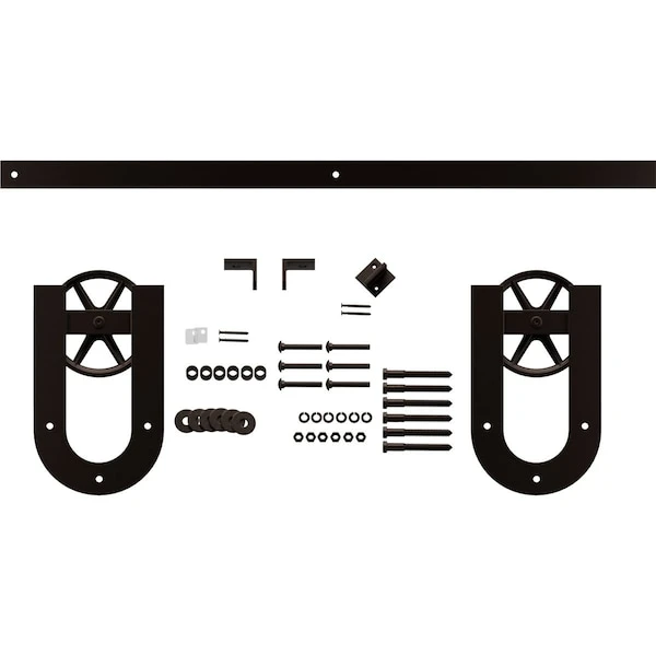 - Set includes: 2 wagon wheel horseshoe hangers, 2 track stops, 2 anti-jump blocks, floor T-guide, all necessary bolts, screws, washers, nuts, etc., for one door.